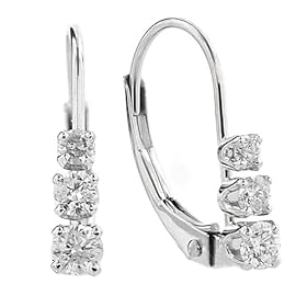 These elegant three-stone diamond earrings are available in your choice of 10 karat white or yellow gold. Three small round diamonds are graduated in size and arranged vertically in individual four-prong settings. Small, subtle, and graceful, these earrings are a pretty accent for daytime or evening wear. They have a total diamond weight of 1/4 carat and are featured on comfortable curved wires with leverback closures.