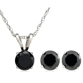 This simple and elegant stud earring and pendant set features a total of three small round black diamonds (1 cttw), prong set in your choice of 14 karat white or yellow gold. The earrings are set on posts with friction back closures, while the dainty and petite pendant is fitted with a split bale and showcased on a very slender and delicate rope chain. Black diamonds, also known as carbonado diamonds, are found only in Brazil and the Central African Republic. Recently, geologists have found compelling evidence that these mysterious gems actually formed in outer space and traveled to Earth billions of years ago inside of meteorites. Their intriguing origins make black diamonds a unique and sublime choice.