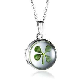 Tap into the luck o' the Irish with this charming silver locket, featuring a genuine four-leaf clover encased beneath a transparent coating. A pretty accent piece that doubles as a good luck charm, the locket hinges open, allowing you to tuck a photo or small talisman inside. It presents on a delicate 18-inch sterling silver chain that fastens with a spring ring clasp.