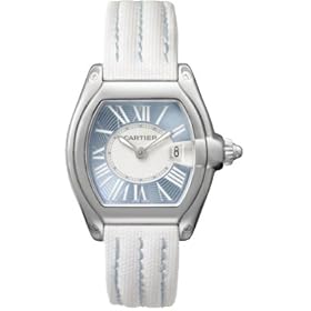 Limited edition of 2500 pieces. Stainless steel case. White fabric strap. Light blue and white dial. Date displays at 3 o'clock position. Scratch resistant sapphire crystal. Fold-through buckle deployment clasp. Case diameter 36mm. Quartz movement. Water resistant at 100 meters (330 feet). Cartier Roadster Limited Edition Ladies Watch W62053V3