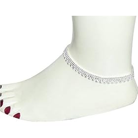 Absolutely charming, sterling silver Ankle Bracelet goes well with any casual dress for women, occidental or oriental. This ankle jewelry is particularly suited for summers when women love to wear sandals. The feet of an Indian woman are very often adorned with beaded ankle bracelet. Silver ankle bracelet is a perfect gift for valentine.Ankle Bracelet chains are of two basic types, i.e. the stiff and the flexible. The stiff anklets are either cast or fabricated by hammering sheet metal into the requisite shape. Using the techniques of chiseling, engraving, repousse, granulation, or threading and wire work, anklets are patterned. The flexible variety employs close interlocking of separately made links tied together either by using variations of chain technique or by threading together of links. Known as Jhanjhar or Paijeb, the flexible variety is often further adorned with jingle bells. There is no better music to the years of a lover than the jingling sound arising from the steps of his beloved. Toe ring ankle bracelet is combination jewelry of sterling silver toe ring and ankle braclet. Body jewelry toe ring are worn along with slippers or on bare foot. Sterling toe ring is sometimes also adorned with semi precious gem stones. (anklt543)